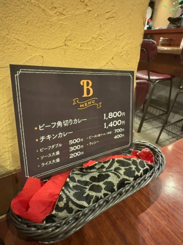 メニューはシンプルにビーフ角切りカレーとチキンカレーの2種のみ