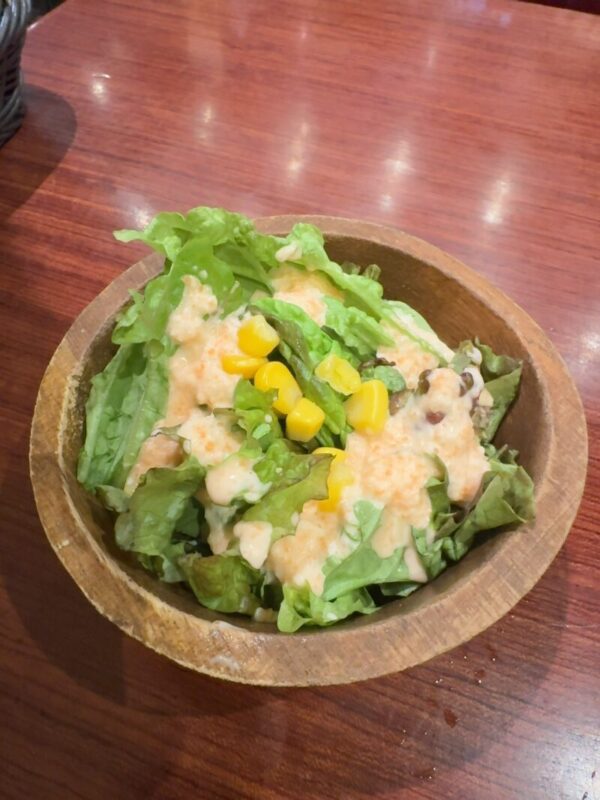 最初に出てくるサラダ、レタス&コーンにドレッシングののシンプルスタイル