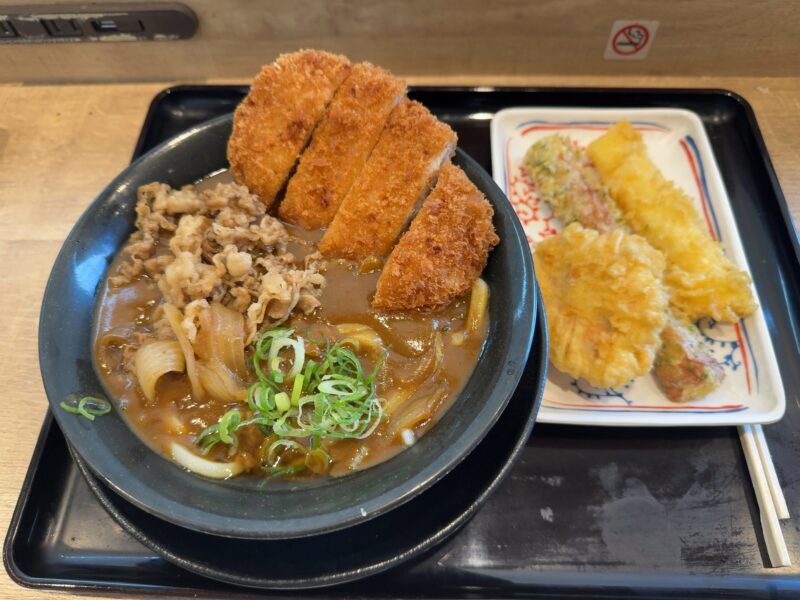 「あふれ盛り肉カレーうどん」1,300円+「とり天」190円+「ちくわ磯辺揚げ」130円+「いか天」190円
