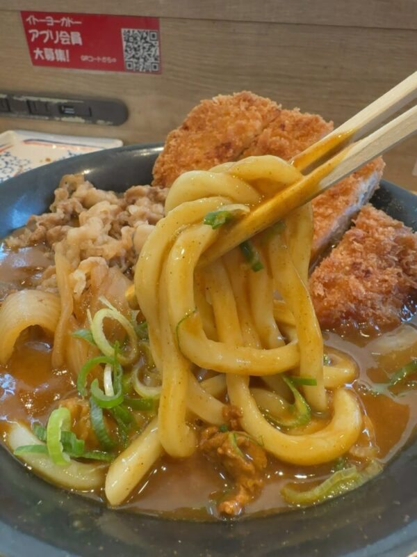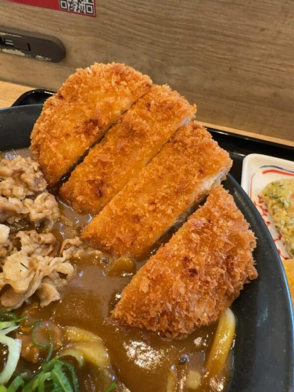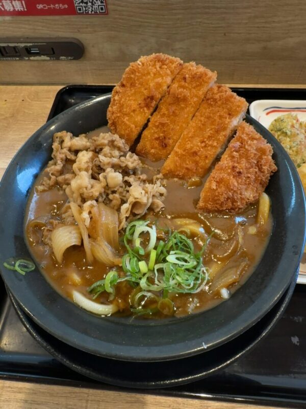 うどん2玉は約420g、カレー汁と牛肉に豚カツと合わせて約950g
