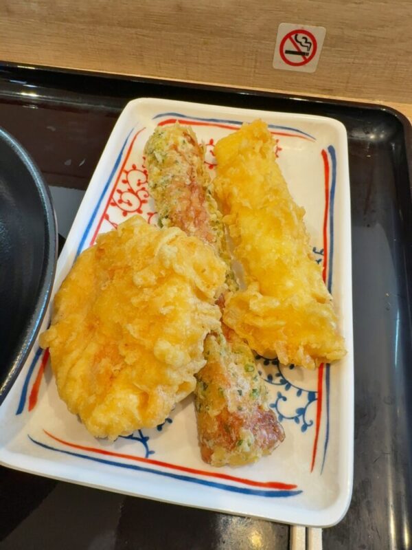 トレーをもってトッピングを数点チョイスしてうどんを注文、会計を済ませて空いている席に着きます