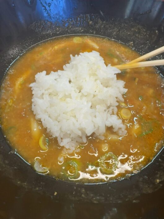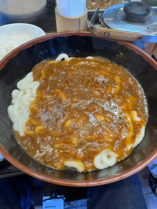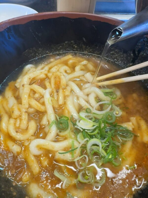 途中からスープを入れる事で「カレーぶっかけうどん」→「カレー出汁うどん」へと味変が出来るのです!