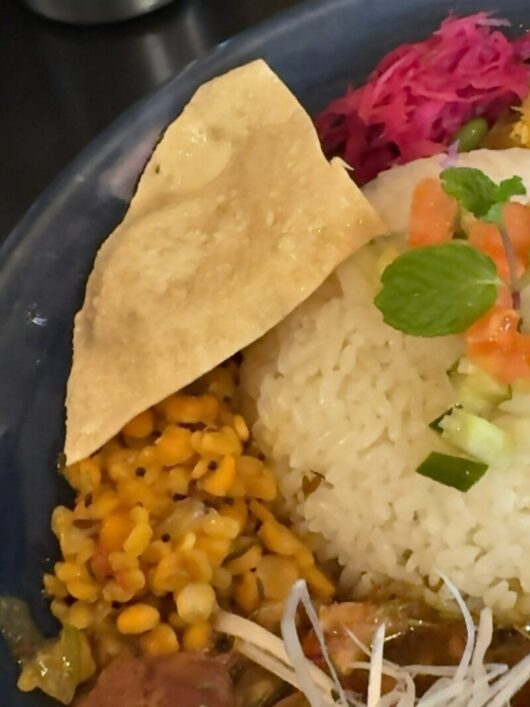 副菜・ダル・パパドもそえられているので少しずつ混ぜ合わせて食べる