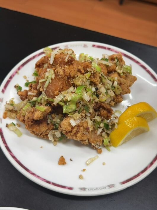 カラッと揚げられた唐揚げの上には油通しした葱・山椒・胡椒がソースのようにかけられています