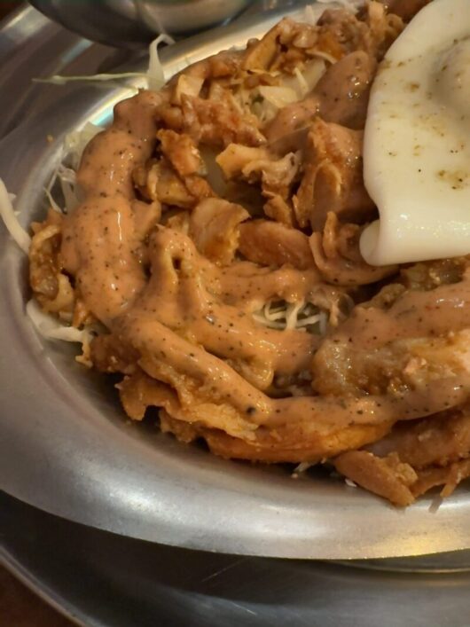 ライスの上にキャベツ、その上に大量のチキンケバブ